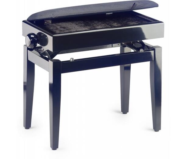 Deze hoogglans-zwarte pianobank heeft een opbergvak en brandveilige Ribfluwelen bekleding!