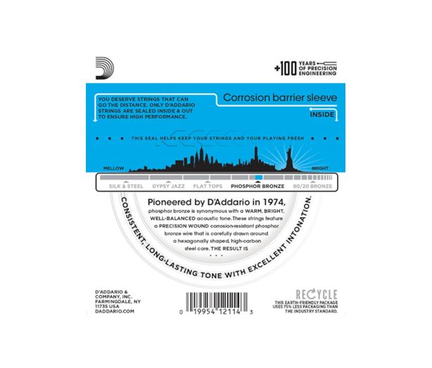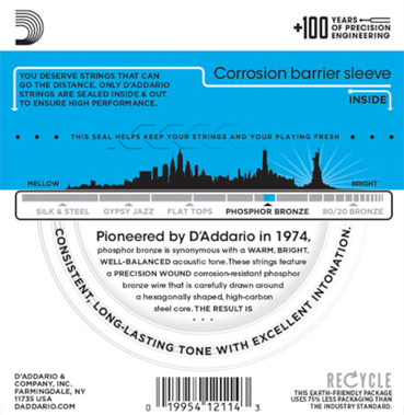 Phosphor Bronze werd in 1974 door D'Addario gentroduceerd bij het maken van snaren en is synoniem geworden met warme, heldere en goed uitgebalanceerde akoestische tonen. D'Addario Phosphor Bronze-snaren zijn nauwkeurig gewonden met corrosiebestendig fosforbrons op een zorgvuldig getrokken, hexagonaal gevormde, koolstofarme kern. Het resultaat is een langdurige, helder klinkende toon met uitstekende intonatie.