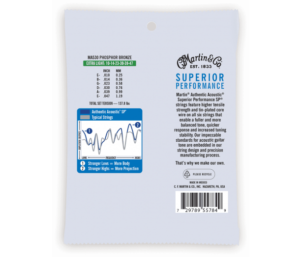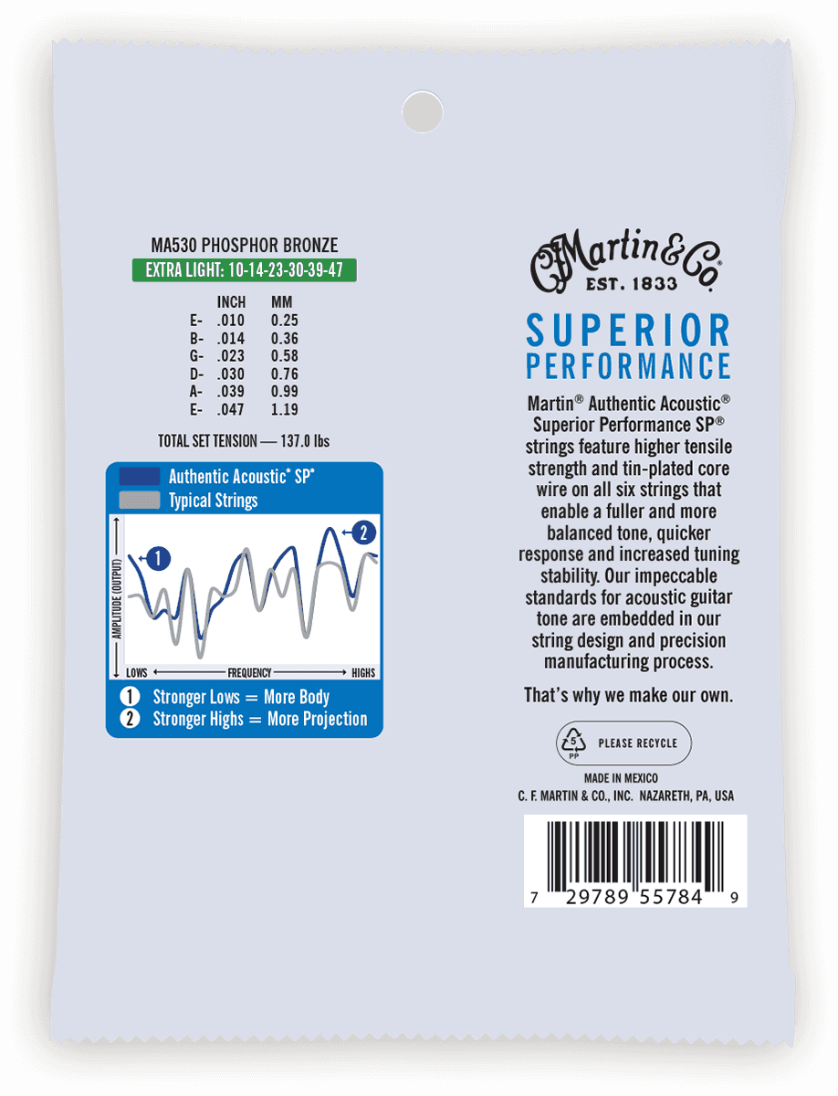 Martin Authentic Acoustic snaren zijn ontworpen om te voldoen aan de behoeften van gitaristen. Uitgaande van een zeer sterke kern voegde Martin een laag tin toe aan de 6 snaren voor een verhoogde weerstand tegen corrosie. Ze werden vervolgens voorzien van een winding van hoge kwaliteit die een consistent geluid voor een uitermate lange duur.