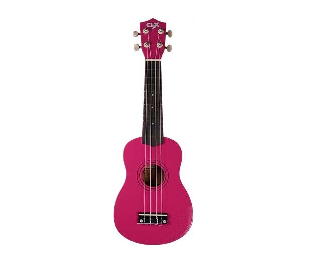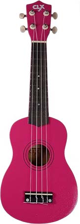 Sopraan ukelele van hout. Diep roze kleur met fijne glitter lak.